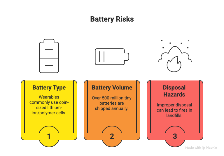 Most wearables use tiny lithium-ion or lithium-polymer cells, often glued directly into the casing. Removing them is tricky, sometimes impossible without destroying the device. From a recycling perspective, this is dangerous. Puncture one of these micro-batteries and you risk fire or toxic leakage.